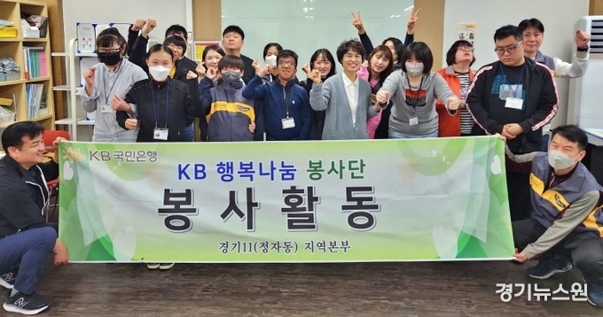 KB국민은행 정자동지역본부(본부장 홍진선)행복나눔 봉사단과 파장동지점(지점장 이위재) 및 경기도청점(점장 엄석민) 직원과 가족들은 14일 올해 11번째 봉사활동으로 수원시 화서동에 위치한 에이블장애인직업적응훈련센터(원장 권나희)를 방문하여 봉사활동을 했다.
