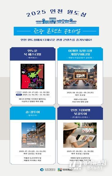 [경기뉴스원/경기뉴스1] | 인천광역시와 인천관광공사는 인천 원도심의 역사·문화와 관광자원, 먹거리 등을 결합한 신규 콘텐츠를 발굴하기 위해 '2025 인천 원도심 관광 콘텐츠 공모'를 추진하고, 최종 4개 사업을 선정했다고 밝혔다.