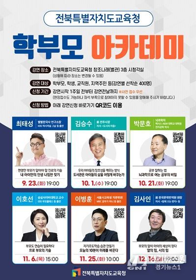[경기뉴스원/경기뉴스1] | 진로진학, 자기주도학습, 자녀교육 분야의 유명 강사들이 전북특별자치도교육청을 찾는다.