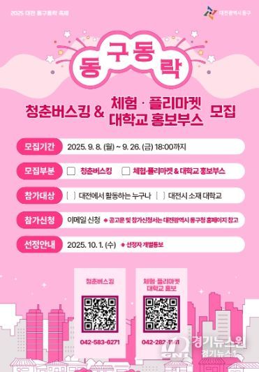 [경기뉴스원/경기뉴스1] | 대전 동구는 내달 개최 예정인 ‘2025 대전 동구동락 축제’를 앞두고, 축제 기간 운영되는 다양한 프로그램에 참여할 참가자를 모집한다고 12일 밝혔다.
