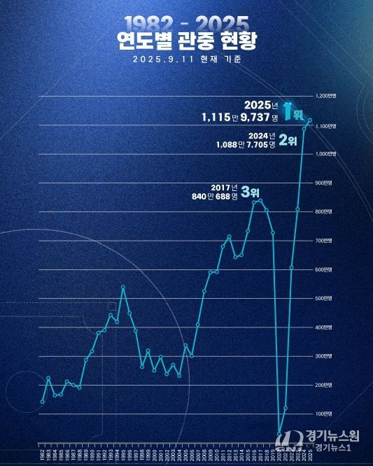 KBO 리그는 출범 첫 해인 1982년부터 지난 해까지 치러진 정규시즌 2만 2,860경기에서 누적 1억 8천 884만 1,044명으로 2억 관중 달성까지 1천115만 8,956명을 남겨두고 2025 시즌을 맞이했다. 어제 9월 11일(목)까지 1천115만9,737명의 관중이 입장하며 정규시즌 누적 2억 781명을 기록했다