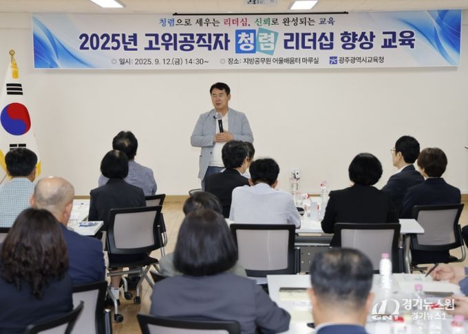 [경기뉴스원/경기뉴스1] | 광주시교육청은 12일 시교육청 지방공무원어울배움터 마루실에서 본청 및 산하기관 4급(상당) 고위공직자 50여 명을 대상으로 ‘2025년 고위 공직자 청렴리더십 향상 교육’을 실시했다.
