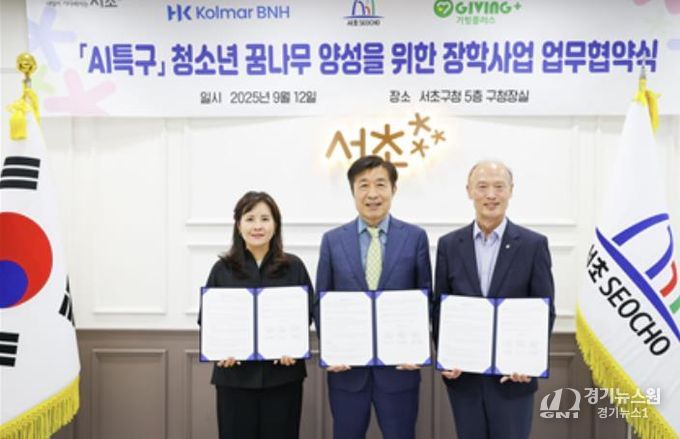 [경기뉴스원/경기뉴스1] | 서울 서초구는 지난 12일, 국내 대표 건강기능식품 연구개발생산 기업 콜마비앤에이치, 재단법인 기빙플러스와 함께 ‘AI특구 청소년 꿈나무 양성을 위한 장학사업’ 업무협약을 체결했다고 밝혔다.