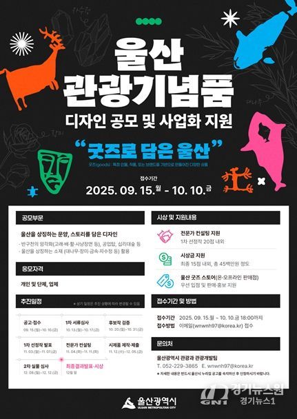 [경기뉴스원/경기뉴스1] | 울산시는 고부가가치 관광기념품 산업의 발전기반 조성과 경쟁력 있는 울산 관광기념품(울산 굿즈) 개발을 위해 ‘울산 관광기념품 디자인 공모 및 사업화 지원’ 공모전을 개최한다고 밝혔다.