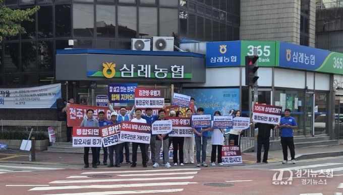[경기뉴스원/경기뉴스1] | 완주군의회 유의식 의장과 이경애 의원이 15일 오전 삼례농협 일원에서 출근길 주민을 대상으로 완주-전주 통합 반대 캠페인을 벌이며 강력한 반대 의지를 밝혔다.