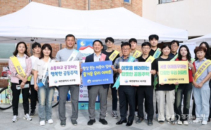 [경기뉴스원/경기뉴스1] | 대전 서구는 관저리슈빌아파트에서 입주자대표회의 구성원, 관리사무소 직원, 입주민 등과 함께 올바른 공동주택 문화 조성을 위한 ‘어깨동무 캠페인’을 진행했다고 15일 밝혔다.