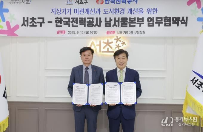 [경기뉴스원/경기뉴스1] | 서울 서초구가 15일 서초구청에서 한국전력 남서울본부와 ‘지상기기 미관 개선과 도시환경 개선을 위한 업무협약’을 체결했다고 밝혔다. 이번 협약은 두 기관이 상호 협력하여 서초구 공공보도상 지상기기 정비를 통해 도시환경을 개선하고 쾌적한 보행환경을 만들기 위해 추진됐다.