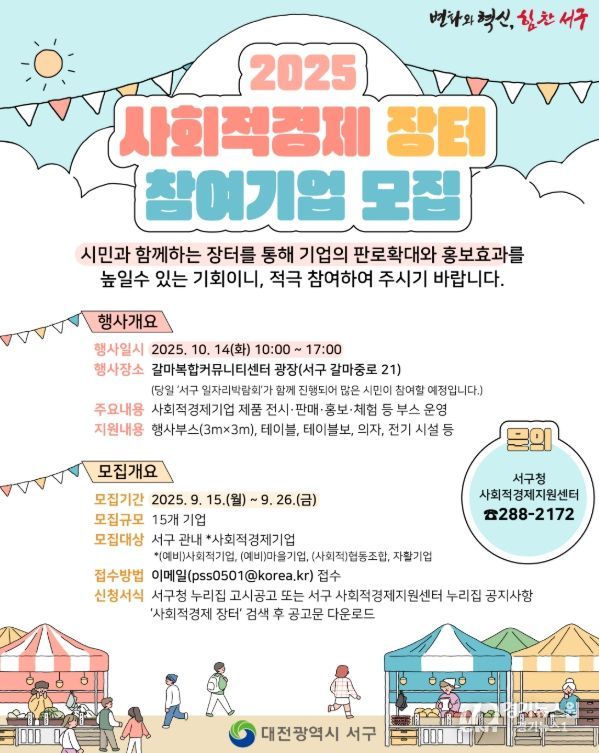 이번 행사는 10월 14일 갈마복합커뮤니티센터 광장(서구 갈마중로 21)에서 열리며, 선정된 15개 사회적경제기업은 부스를 지원받아 제품·서비스 전시와 판매, 홍보 활동을 펼칠 수 있다.