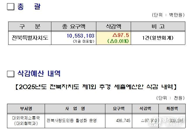 [경기뉴스원/경기뉴스1] | 전북특별자치도의회 예산결산특별위원회(위원장 김명지, 전주11)는 9월 12일과 9월 15일 두 차례 회의를 거쳐, 총 11조 4,781억 원(예산 10조 5,531억 원, 기금 9,250억 원) 규모의 2025년도 제2회 추경예산안을 심사·의결했다.