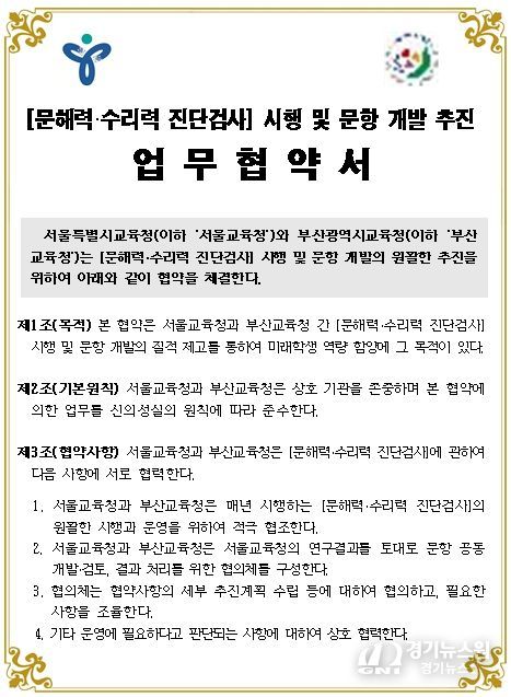 [경기뉴스원/경기뉴스1] | 서울특별시교육청과 부산광역시교육청은 2025년 9월 18일, 학생들의 핵심역량 강화를 위한 ‘문해력·수리력 진단검사 개발 및 운영’에 상호 협력하는 업무협약을 체결한다.