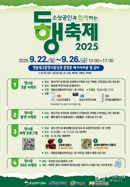 [경기뉴스원/경기뉴스1] | 정읍시가 지역 상권 활성화를 위해 오는 22일부터 26일까지 ‘2025 정다운 할인 동행축제’를 정다운 상권 일원에서 개최한다.