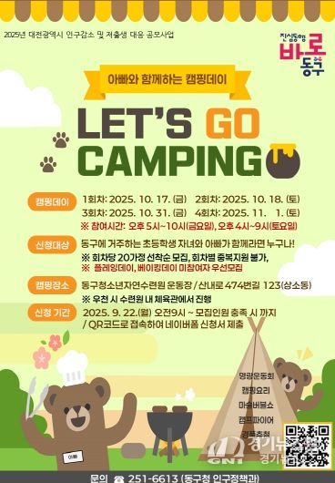[경기뉴스원/경기뉴스1] | 대전 동구는 아빠의 육아참여 독려 및 일·가정 양립 환경 조성을 위해 추진하는 ‘아빠와 함께하는 신나는 하루’ 시리즈의 세 번째 프로그램인 ‘아빠와 함께하는 신나는 캠핑데이’ 참여자를 모집한다고 22일 밝혔다.