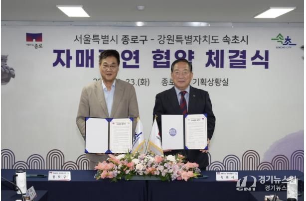 [경기뉴스원/경기뉴스1] | 종로구는 9월 23일 구청 기획상황실에서 속초시와 자매결연을 맺었다. 이로써 두 도시는 교육·문화·관광을 비롯해 재난 대응까지 다양한 분야에서 교류와 협력을 강화할 방침이다.