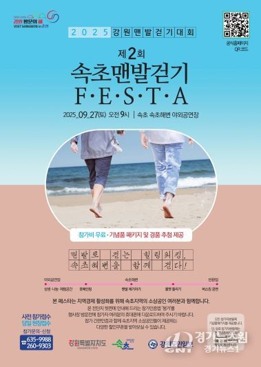 [경기뉴스원/경기뉴스1] | 속초시는 강원특별자치도 및 강원도민일보와 함께 오는 9월 27일 속초해수욕장에서 외옹치해수욕장 구간을 따라 ‘제2회 2025 속초시 강원 맨발걷기 대회’를 연다. 지난해에 이어 두 번째로 마련되는 이번 대회는 자연 속에서 맨발로 걸으며 건강과 힐링을 동시에 경험할 수 있는 특별한 축제다.