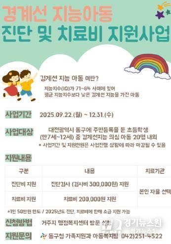 [경기뉴스원/경기뉴스1] | 대전 동구는 경계선지능아동(느린학습자)이 건강한 사회구성원으로 성장하고 자립할 수 있도록, 고향사랑기금을 활용한 ‘경계선지능아동 검사 및 치료비 지원사업’을 본격 추진한다고 24일 밝혔다.