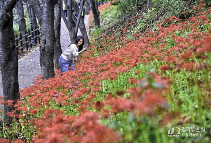 [경기뉴스원/경기뉴스1] | 울산 남구 선암호수공원이 가을을 붉게 수놓은 꽃무릇으로 물들고 있다.
