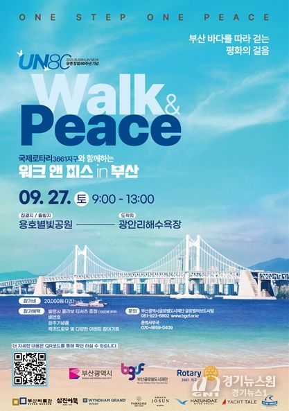 [경기뉴스원/경기뉴스1] | 부산글로벌도시재단(전용우)은 9월 27일 09시부터 용호별빛공원에서 '국제로타리 3661지구와 함께하는 워크 앤 피스 in 부산'행사를 개최한다고 밝혔다.