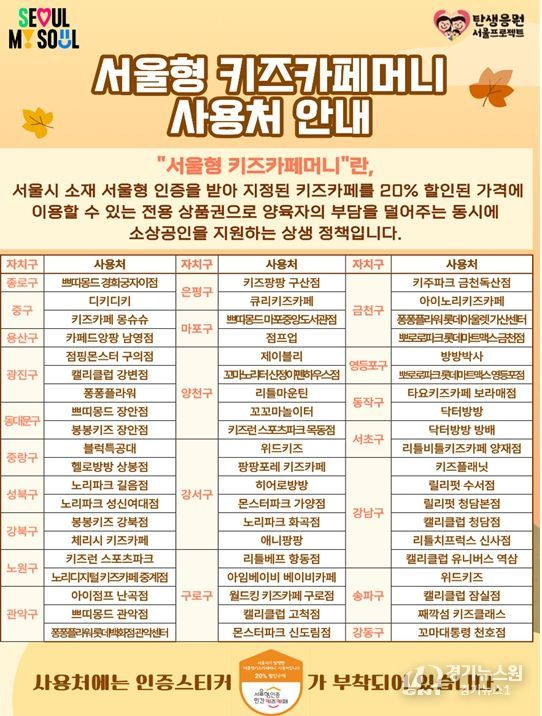 [경기뉴스원/경기뉴스1] | 열흘 안팎의 긴 추석연휴를 앞두고 아이들과 양육자가 보다 부담 없는 가격으로 키즈카페에서 즐거운 연휴를 보낼 수 있도록 서울시가 20% 할인 혜택이 있는 ‘서울형 키즈카페머니’ 11억 원을 추가 발행한다고 밝혔다.