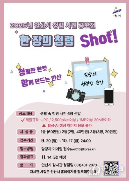 [경기뉴스원/경기뉴스1] | 안산시는 청렴문화 확산과 시민 공감대 형성을 위해 ‘2025 한 장의 청렴, Shot! 사진 공모전’을 개최한다고 30일 밝혔다.