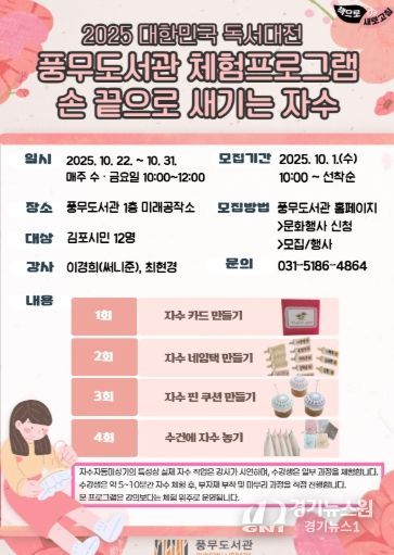 [경기뉴스원/경기뉴스1] | 김포시 풍무도서관은 2025 대한민국 독서대전 사업의 일환으로 오는 10월 22일부터 31일까지 총 4회에 걸쳐 수·금요일 오전 10시부터 12시까지 ‘손 끝으로 새기는 자수’를 운영한다.