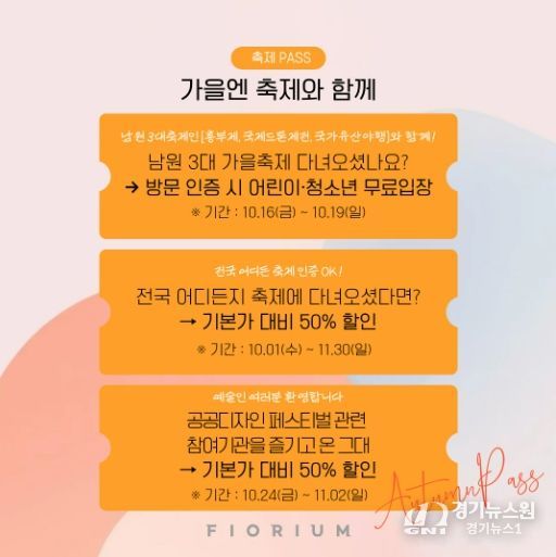 [경기뉴스원/경기뉴스1] | 남원시 미디어아트 전시관 피오리움(Fiorium)이 가을철을 맞아 다양한 무료·할인 혜택을 담은 ‘어텀패스(Autumn Pass)’를 선보인다. 가을시즌 주요 행사와 연계해 시민과 관광객 모두가 즐길 수 있도록 마련됐다.