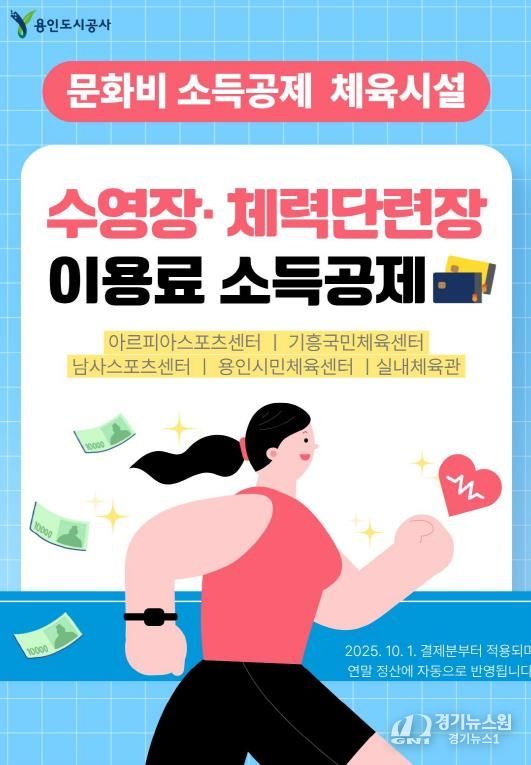 [경기뉴스원/경기뉴스1] | 용인도시공사는 시민들의 건강 증진과 여가 복지 확대를 위해 오는 10월 1일부터 수영장‧체력단련장 시설 이용료와 강습비에 대해 문화비 소득공제 혜택을 적용한다고 밝혔다.