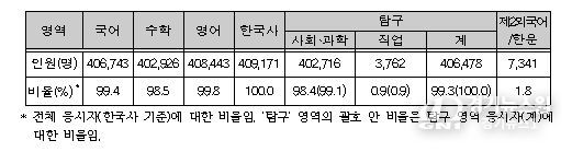 국어 영역의 경우, 사회탐구 영역 58.3%, 과학탐구 영역 22.4%이었으며, 사회탐구와 과학탐구 영역을 조합해 응시한 비율은 17.8%이었다.