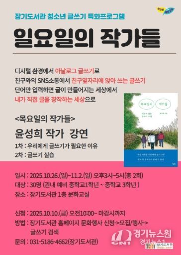 [경기뉴스원/경기뉴스1] | 김포시 장기도서관은 청소년 글쓰기 특화프로그램으로 '일요일의 작가들'을 오는 10월 26일, 11월 2일 오후 3시부터 5시까지 장기도서관 1층 문화교실에서 운영한다고 밝혔다