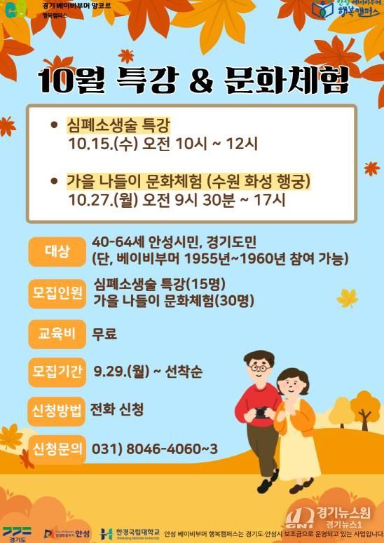 [경기뉴스원/경기뉴스1] | 안성 베이비부머 행복캠퍼스(한경국립대학교 평생교육원)는 오는 10월 15일부터 27일까지 중장년 안성시민(경기도민)을 대상으로 ‘10월 특강(심폐소생술) 및 문화체험(수원화성행궁)’ 프로그램을 운영한다고 밝혔다.