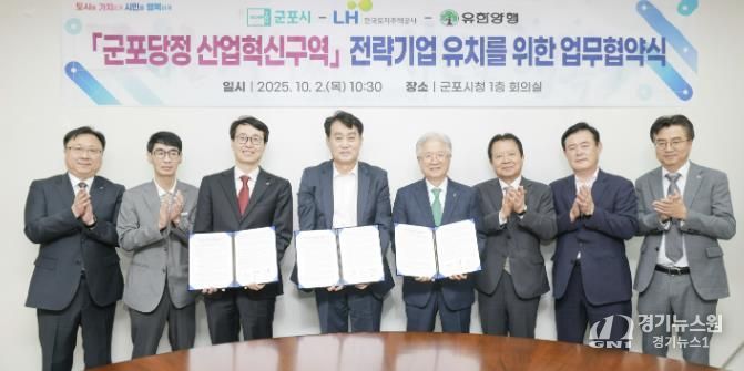 [경기뉴스원/경기뉴스1] | 군포시는 2일 군포시청에서 한국토지주택공사(LH), ㈜유한양행과 ‘군포당정 산업혁신구역’ R·D 전략기업 유치를 위한 업무협약을 체결했다고 밝혔다.