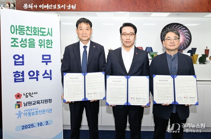 [경기뉴스원/경기뉴스1] | 남원시는 지난 2일 남원교육지원청, 전북동부아동보호전문기관과 함께 아동친화도시 조성 및 아동 권리 증진을 위한 업무협약식을 체결했다.