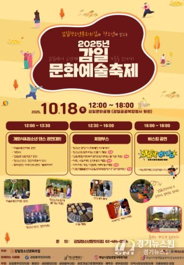 [경기뉴스원/경기뉴스1] | 하남시 감일청소년문화의집은 오는 10월 18일 오후 12시부터 18시까지 감일문화공원(감일공공복합청사 뒷편)에서 '제2회 감일문화예술축제'를 개최한다.