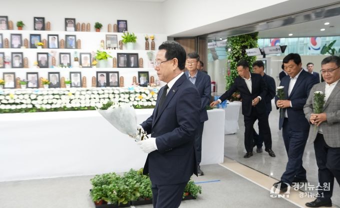 [경기뉴스원/경기뉴스1] | 김영록 전라남도지사는 추석을 앞둔 3일 제주항공 여객기 사고 희생자 무안공항 합동분향소를 찾아 헌화·분향하며 희생된 분들의 넋을 기렸다.