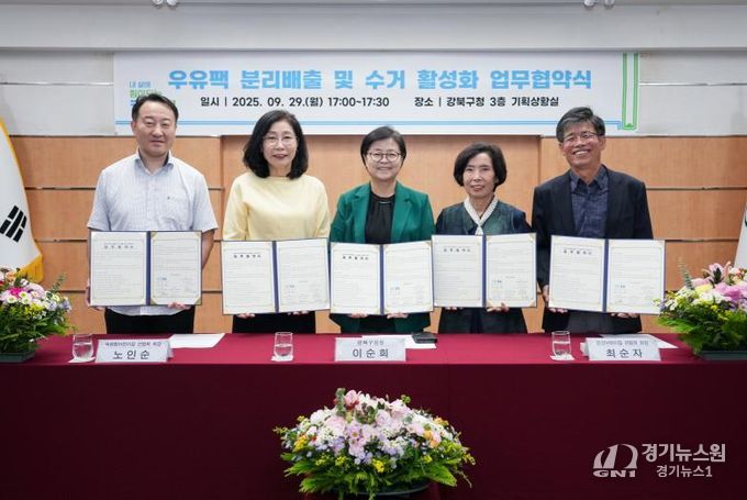 [경기뉴스원/경기뉴스1] | 서울 강북구는 9월 29일(월) 구청 기획상황실에서 강북구어린이집연합회와 어진이마을관리 사회적협동조합과 함께 우유팩 분리배출 및 수거 활성화 기반 구축을 위한 업무협약을 체결했다고 밝혔다.