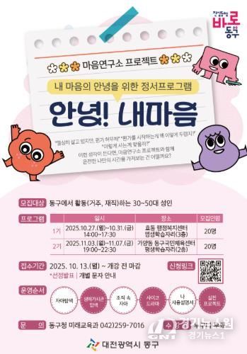 [경기뉴스원/경기뉴스1] | 대전 동구는 오는 13일부터 ‘내 마음의 안녕을 위한 정서프로그램’ 학습자를 모집한다고 10일 밝혔다.