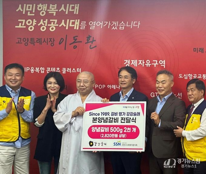 [경기뉴스원/경기뉴스1] | ㈜전한의 외식브랜드 강강술래(대표 노상환)가 10월 10일, 고양특례시에 본양념갈비 500g 2,000개(2,820만 원 상당)를 기탁했다. 이번 전달식은 고양특례시청 열린시장실에서 진행됐으며, 이동환 고양특례시장, 김민숙 고양특례시의원(고양, 관산, 원신), 노상환 강강술래 대표, 김응화 고양시사회복지협의회 회장이 함께 자리했다.