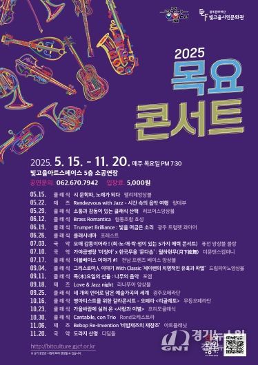 [경기뉴스원/경기뉴스1] | 광주문화재단(대표이사 노희용)은 오는 10월 16일, 23일, 30일 목요일 저녁 7시 30분, 빛고을아트스페이스 5층 소공연장에서 ‘10월의 목요콘서트’를 개최한다고 밝혔다.