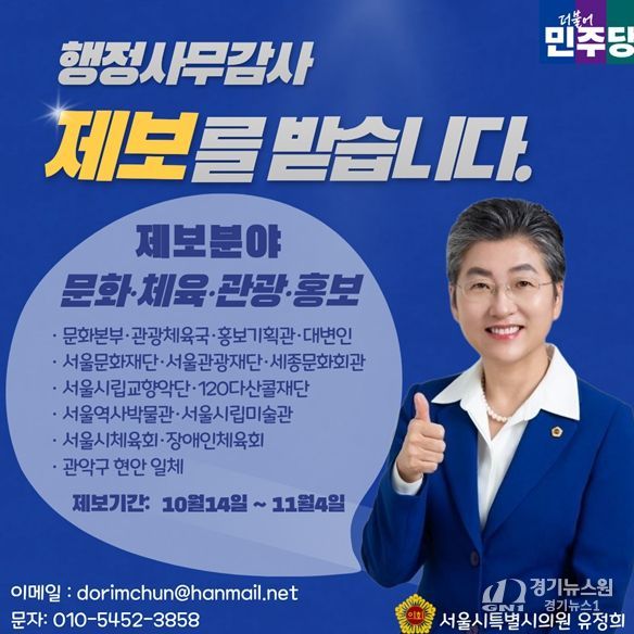 [경기뉴스원/경기뉴스1] | 서울특별시의회 문화체육관광위원회 유정희 의원(더불어민주당, 관악4)은 10월 14일부터 11월 4일까지 시민 의견을 직접 접수받는 ‘행정사무감사 시민제보창구’를 운영한다고 밝혔다.