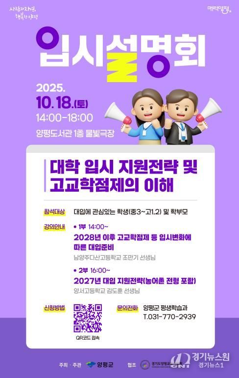[경기뉴스원/경기뉴스1] | 양평군은 오는 10월 18일 오후 2시, 양평도서관 물빛극장에서 관내 학생과 학부모를 대상으로 ‘2025년 양평군 대학 입시설명회’를 개최한다고 밝혔다. 이번 설명회는 대학 입시에 관심 있는 학생과 학부모에게 다양한 입시 정보를 제공하기 위해 마련됐다.