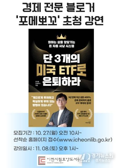 [경기뉴스원/경기뉴스1] | 이천시 효양도서관은 시민들의 경제적 이해력 향상과 현명한 자산 관리 능력 제고를 위해 오는 11월 8일 오후 1시, '단 3개의 미국 ETF로 은퇴하라'의 저자이자 네이버 경제 전문 블로거 김지훈(필명 포메뽀꼬)을 초청해 재테크 특강을 진행한다.