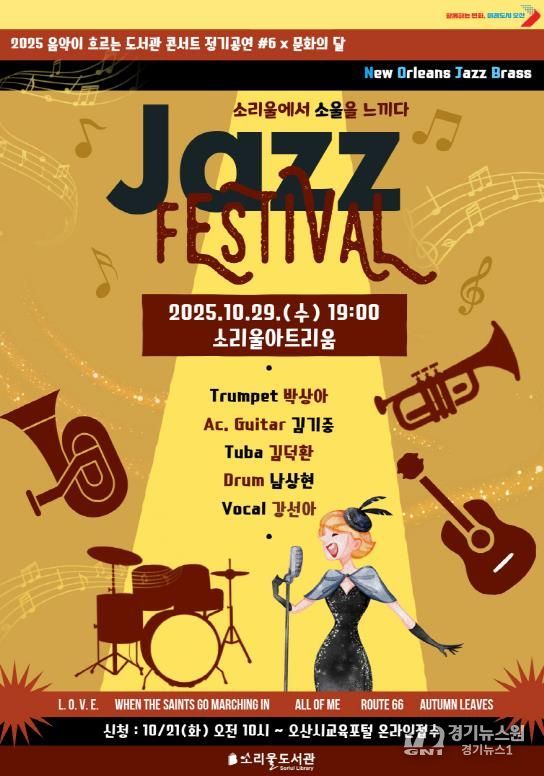 [경기뉴스원/경기뉴스1] | 경기도 오산시는 오는 10월 29일 오후 7시, 소리울도서관 3층 소리울아트리움에서 '2025 음악이 흐르는 도서관 콘서트 정기공연 #6 × 문화의 달 – Jazz Festival; 소리울에서 소울을 느끼다'를 개최한다고 밝혔다.