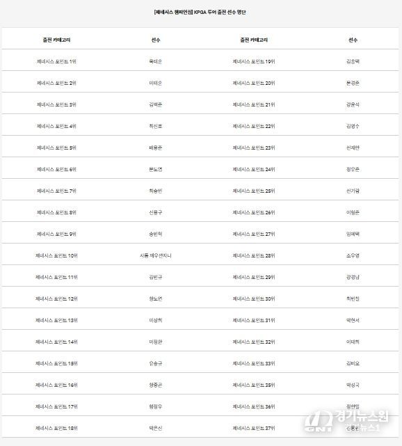 ‘더채리티클래식 2025’ 전까지 제네시스 포인트 42위에 위치했던 정한밀(34.경희)은 ‘더채리티클래식 2025’에서 공동 21위에 올라 제네시스 포인트 순위가 6계단 상승해 제네시스 포인트 36위로 대회 출전 자격을 획득했다.