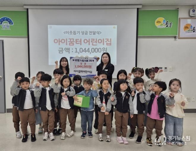 [경기뉴스원/경기뉴스1] | 양평군 용문면은 지난 20일 용문면 소재 아이꿈터 어린이집이 주최한 ‘소소한 기쁨, 특별한 만남, 행복 나눔 작은 장터’ 바자회를 통해 마련된 수익금 1,044,000원을 용문면에 기탁했다고 밝혔다.