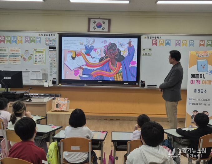 [경기뉴스원/경기뉴스1] | 박범인 금산군수는 지난 24일 남일초를 방문해 학생들과 함께 그림책 읽는 시간을 가졌다.