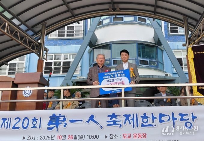 [경기뉴스원/경기뉴스1] | 제주도교육청 제주제일중학교는 26일 열린 제20회 제주제일중학교 총동문회‘제일인(弟一人) 축제 한마당’에서 제8회 졸업생 오헌봉 ㈜유성건설 회장이 학교 발전을 위해 2025년부터 2027년까지 3년간 매년 1천만 원씩, 총 3천만 원의 발전기금을 기탁하기로 하고 첫 해분 1천만 원을 전달했다고 밝혔다.