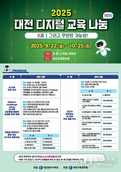 [경기뉴스원/경기뉴스1] | 대전교육정보원은 ‘0과 1 그리고 무한한 가능성’을 주제로 ‘2025년 대전 디지털 교육 나눔1010’ 행사를 9월 22일부터 10월 28일까지 5주간 초·중·고 학생, 교원, 학부모를 대상으로 다채로운 온·오프라인 프로그램을 기획하여 성황리에 운영했다고 밝혔다.