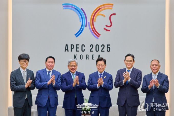 [경기뉴스원/경기뉴스1] | 이재명 대통령은 10월 31일 오후 2시 경주 APEC 정상회의를 계기로 방한한 젠슨 황 엔비디아 대표를 만나, 대한민국 AI 인프라를 비롯한 생태계 전반의 혁신 방안에 대해 의견을 교환했다. 이 자리에는 삼성전자 이재용 회장, SK 최태원 회장, 현대차그룹 정의선 회장, 네이버 이해진 의장이 함께했다.