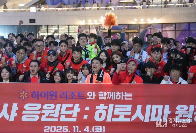 [경기뉴스원/경기뉴스1] | 강원특별자치도는 11월 4일 오후 5시 30분, 일본 히로시마 에디온 피스 윙 스타디움 원정석 게이트 앞에서 ‘강원FC 승리기원 행사’를 개최했다고 밝혔다.