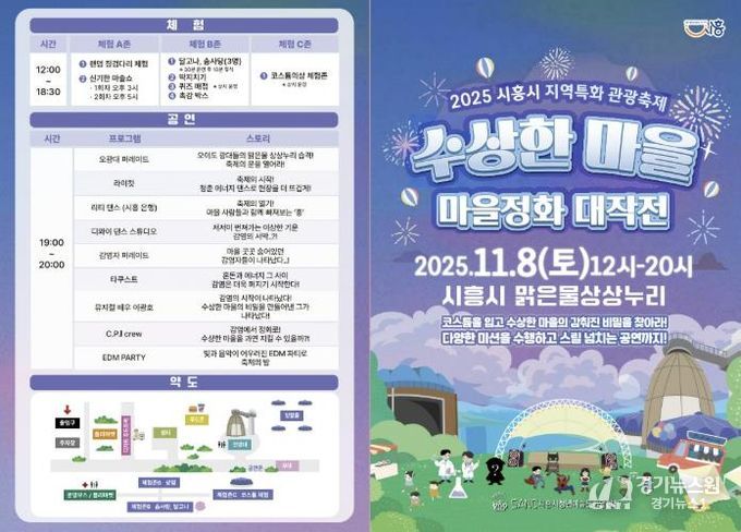 [경기뉴스원/경기뉴스1] | 시흥시는 2025년 시흥시 지역특화 관광축제 지원사업 선정 축제인 ‘수상한 마을 마을정화대작전’을 오는 11월 8일 정왕동 맑은물상상누리 일원에서 개최한다. 이번 축제는 시흥시 청년예술연합회가 주관한다.