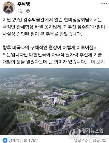 [경기뉴스원/경기뉴스1] | 주낙영 경주시장이 최근 자신의 사회관계망서비스(SNS)에 “감포에 건립 중인 문무대왕과학연구소가 향후 핵추진 잠수함 추진체 기술의 기반이 될 수 있다”고 게시했다.